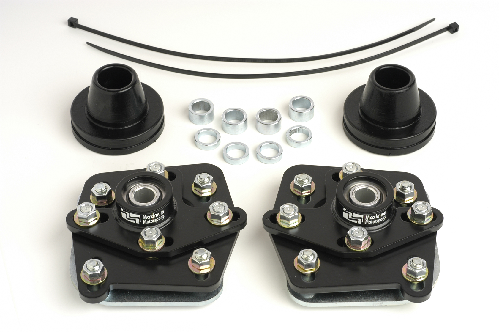 Maximum Motorsports caster camber plates address the issues of obtaining proper alignment and achieving high performance handling. MM's plates are double adjustable. They have seperate adjusting slots to change caster and camber independent of one another. MM caster camber plates are suitable for use with coil-over conversion kits.
